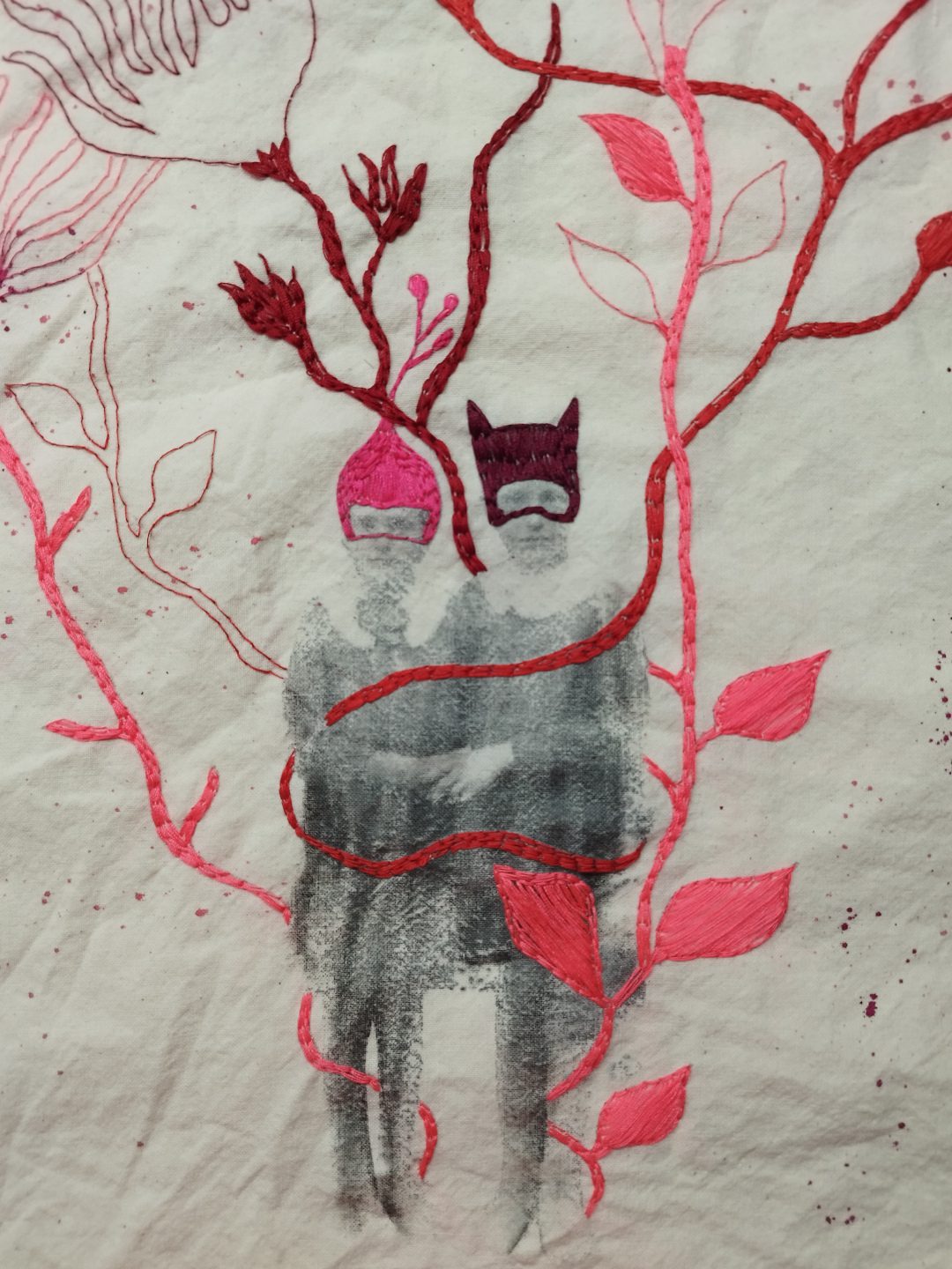 In her work, she enjoys blending fabrics with paper. She uses paints, threads, cut-outs, vintage photos, and acrylic paint. Sometimes she embroiders or sews some elements, appreciating the visible traces of manual handling and the analog process, which she likes to keep evident.